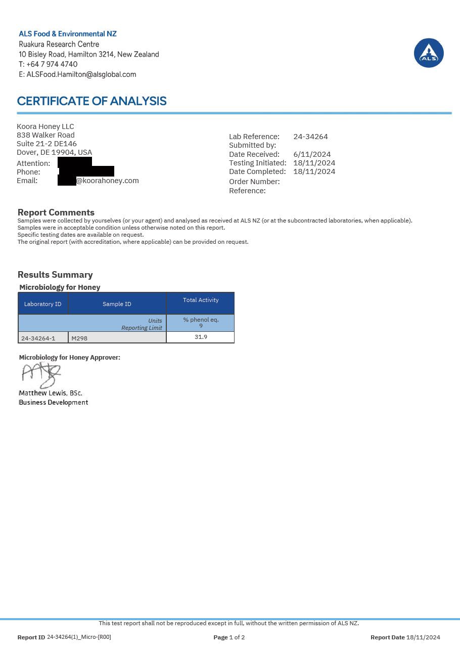 Each batch of honey is lab tested and certified for its antimicrobial rating. At Koora, we always ensure that the antimicrobial rating exceeds that on the Koora Shield on your honey jar label.